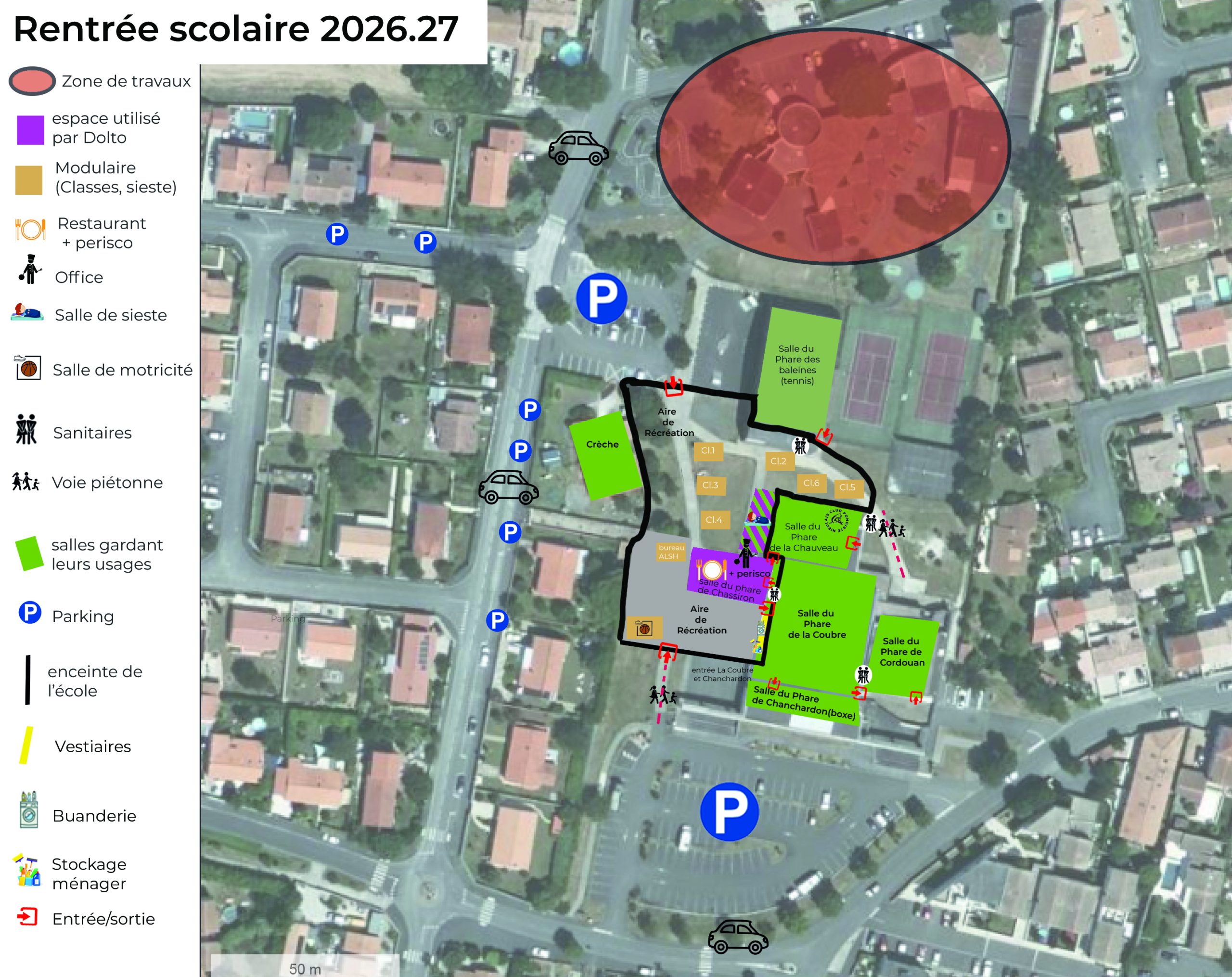 L' école maternelle Françoise Dolto ainsi que l’accueil de loisirs le Gô’Elan seront relocalisés pendant toute la durée des travaux. Des modulaires tout confort, spécialement conçus pour les scolaires, seront installés derrière l’espace Michel Crépeau, à distance du site Dolto afin d’éviter d’éventuelles nuisances liées aux travaux. La salle du phare de Chassiron accueillera la restauration, et celle du phare de Chauveau, la sieste des plus petits et les activités de motricité. L’accueil de loisirs le Gô’Elan du mercredi et des vacances sera transféré à dans les locaux de l’école Alain Devaud. Le retour dans les locaux interviendra uniquement après les vérifications et contrôles nécessaires.