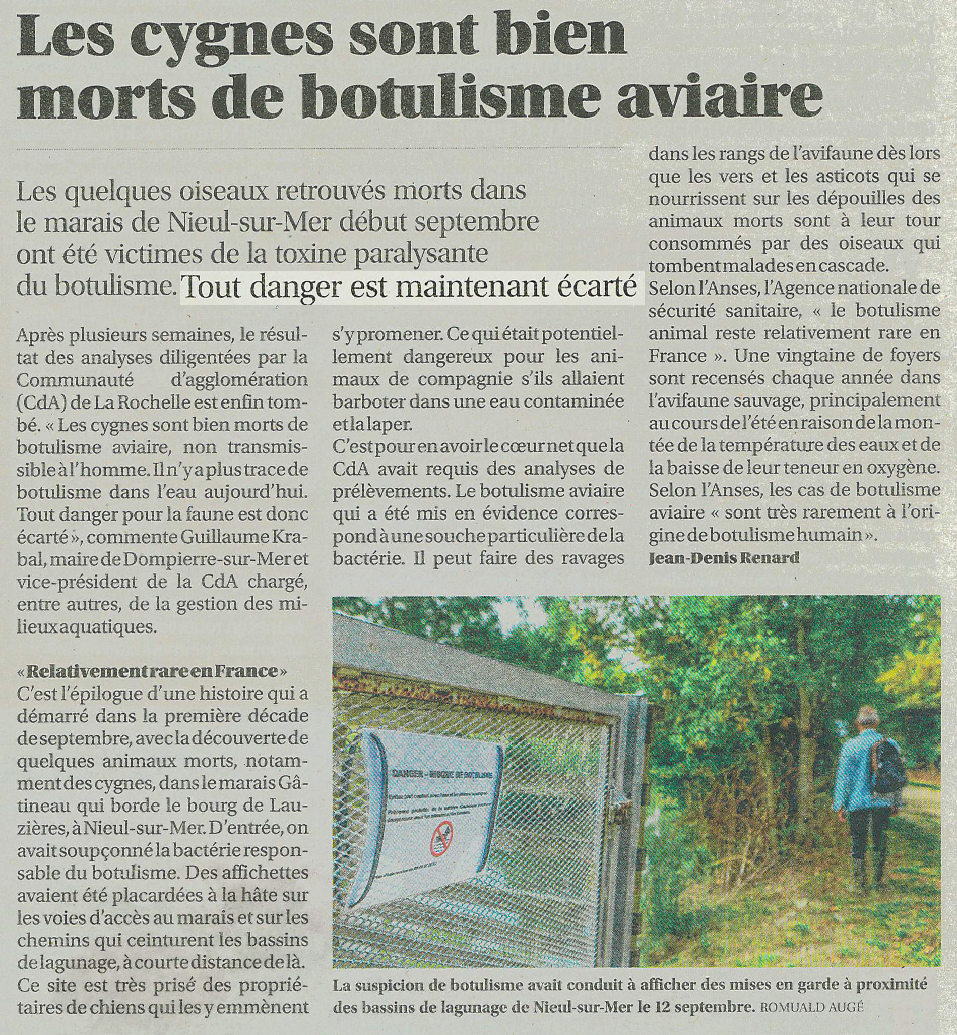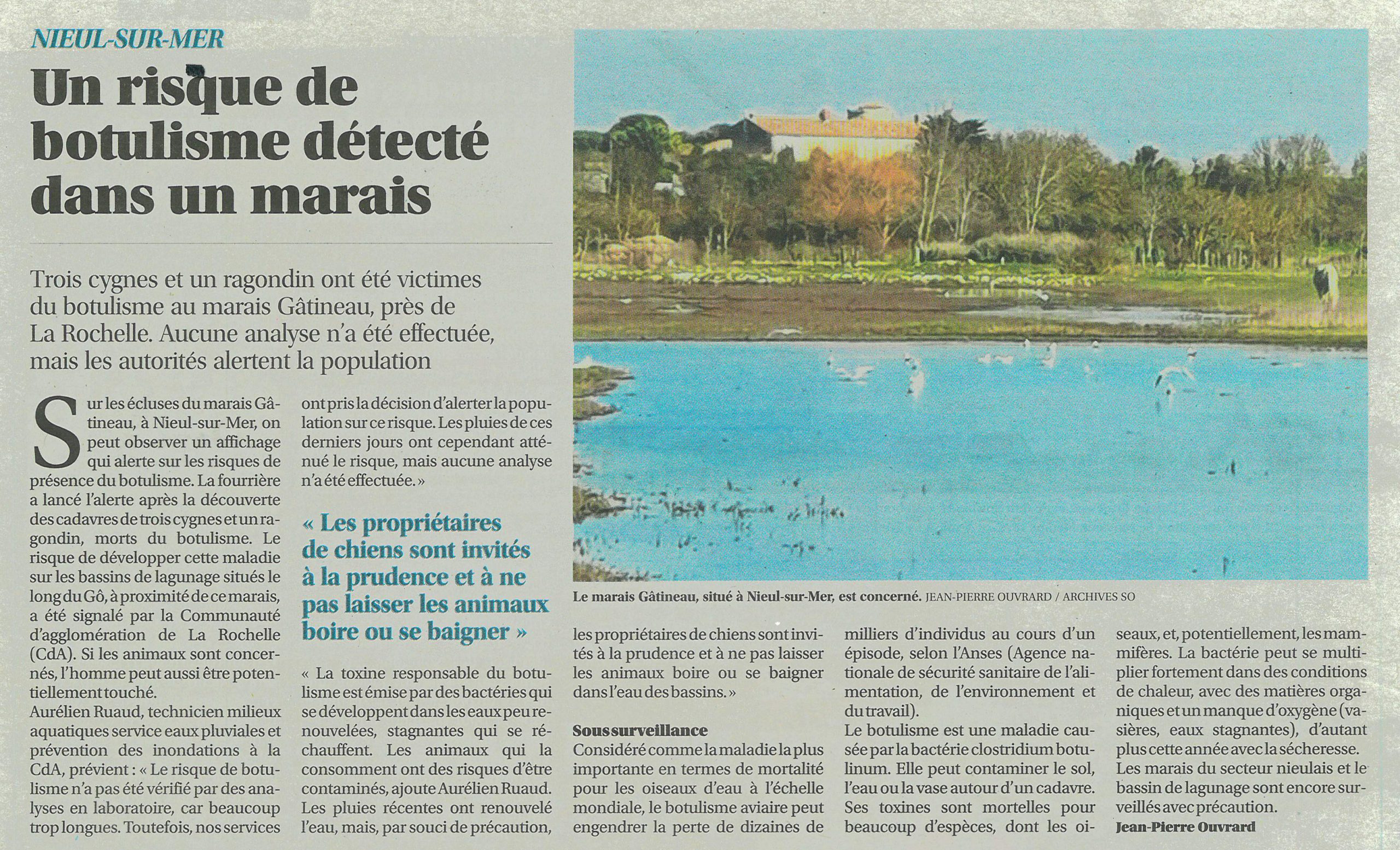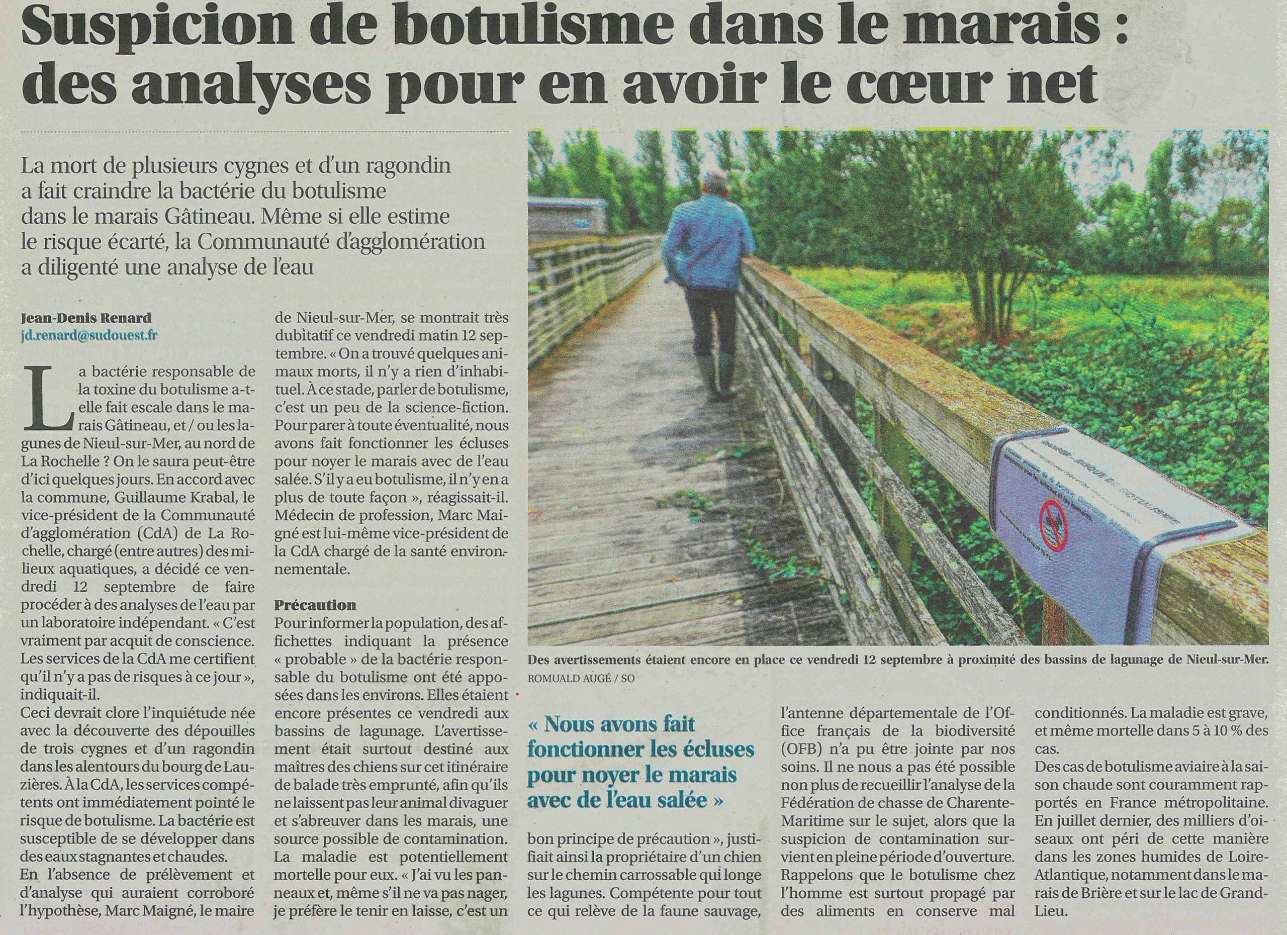 article du 15 septembre : Suspicion de botulisme dans el marais, des analyses pour en avoir le cœur net
