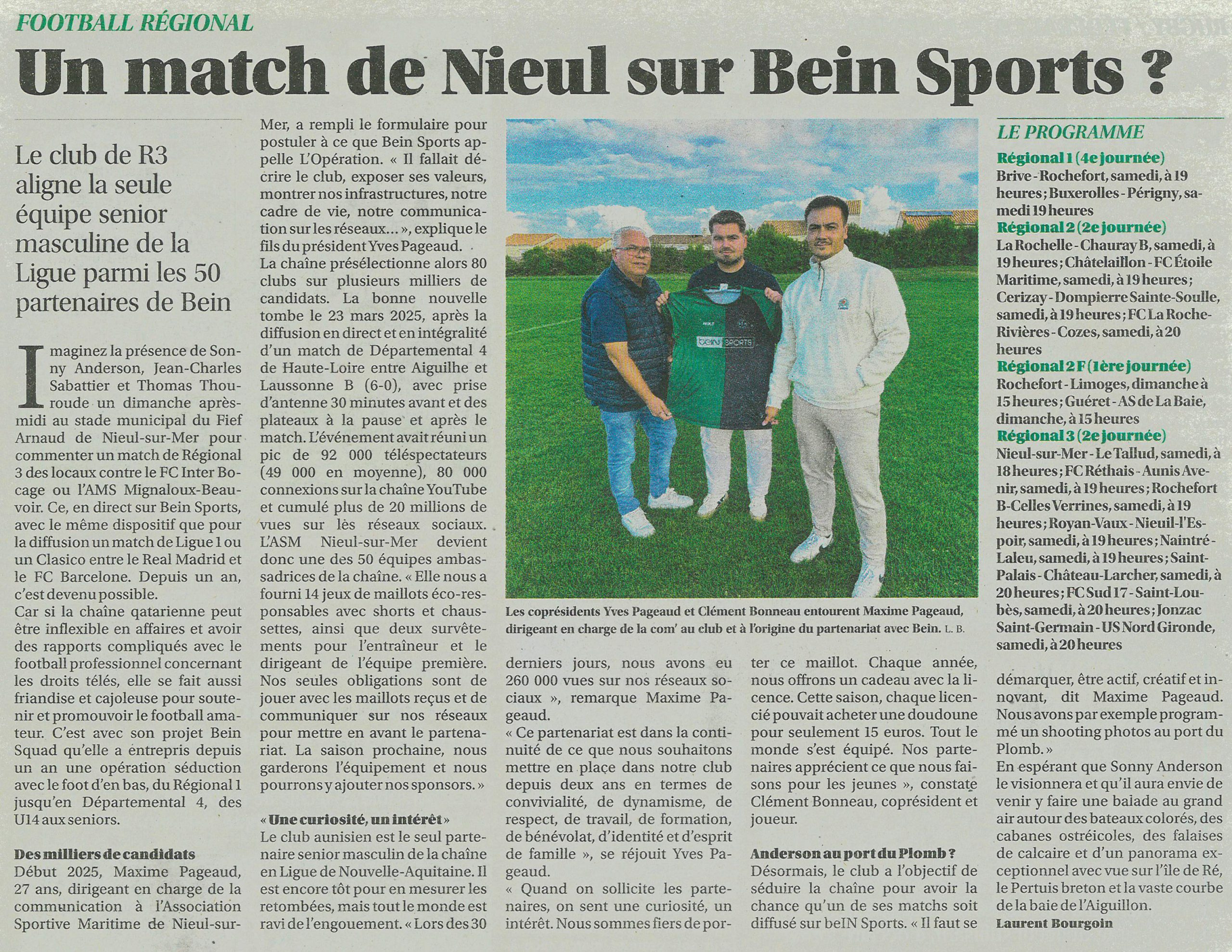 article du 24 septembre : Un match de Nieul sur Bein sports ?